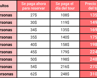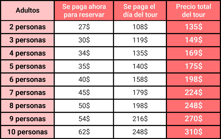 Puedes pagar el 20% para reservar y el resto el primer día del tour, o puedes pagar ahora el 100% del tour.